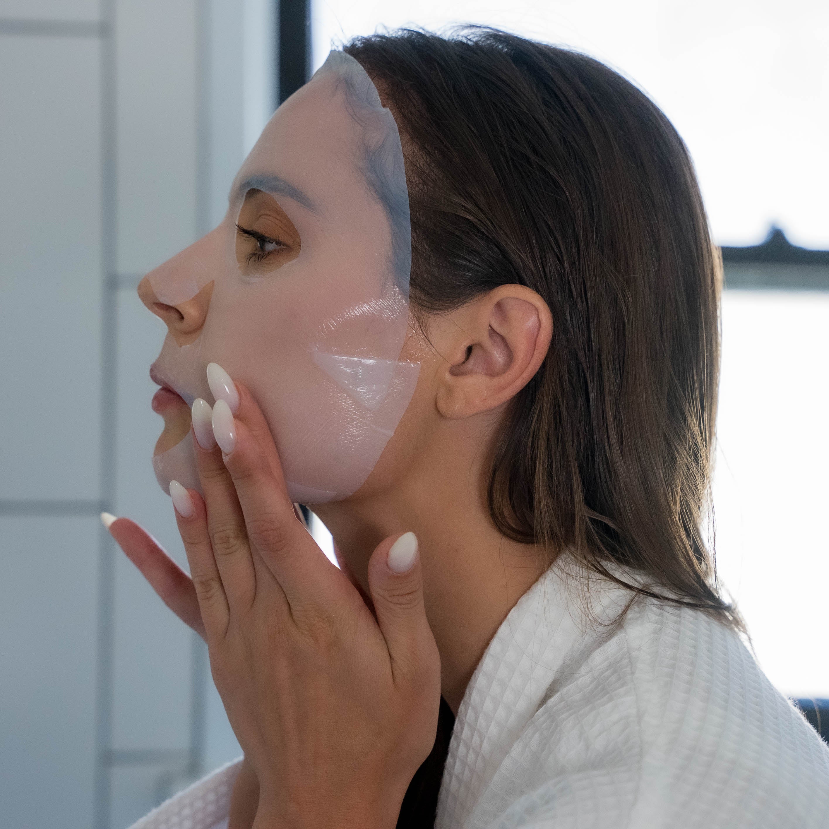 緩慢撕下白色不織布保護層,調整面膜以完美貼合面部輪廓。